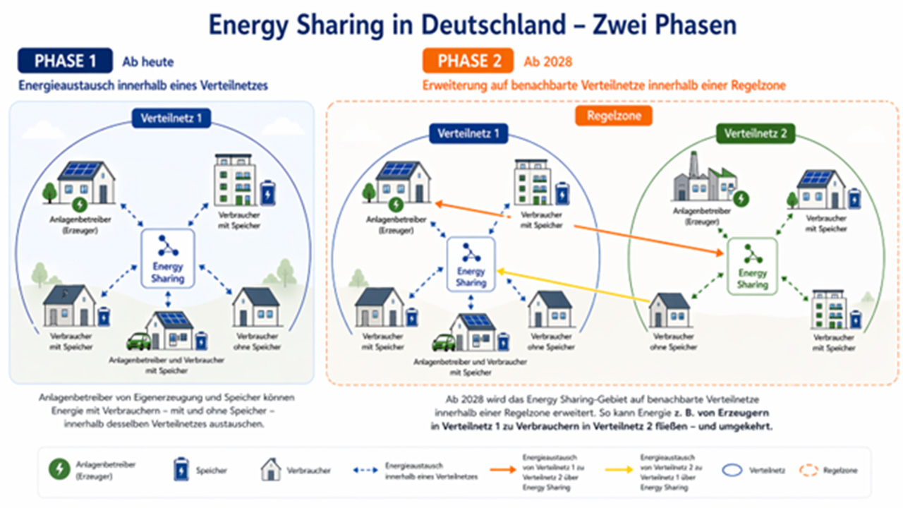- Ab 1. Juni 2026: Energy Sharing ist innerhalb des Bilanzierungsgebietes eines einzelnen Verteilnetzbetreibers (VNB) möglich.